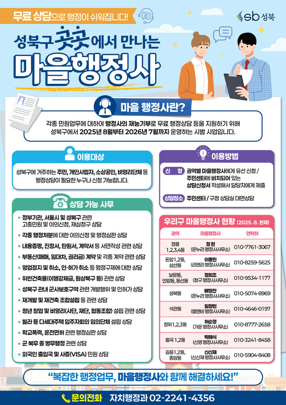 마을 행정사는 생활 속 민원 신청 서류 작성, 법령·규정 안내 등 전문적인 행정 지원을 제공한다. 주민들은 동주민센터나 성북구청 누리집을 통해 담당 행정사를 확인할 수 있으며, 전화로 직접 상담 예약도 가능하다. 구는 이번 제도로 구민들이 생활 속에서 흔히 접하는 민원 신청 서류 작성, 법령·규정 안내 등 다양한 행정 업무를 전문적으로 지원받을 수 있어 민원 사각지대를 해소하고 행정 접근성을 크게 높일 것으로 기대하고 있다.