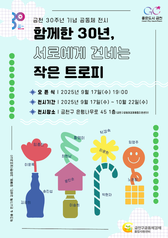 서울 금천구(구청장 유성훈)는 개청 30주년을 맞아 17일부터 금천구공동체경제통합지원센터에서 특별 기념전시 ‘함께한 30년, 서로에게 건네는 작은 트로피’를 연다고 밝혔다.