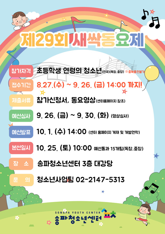 참가 대상 연령은 동요제 7~12세(초등학생), 청소년 축제 13~19세(중·고등학생)이다. 각각 15팀과 10팀의 본선 진출자를 가린 뒤, 오는 10월 1일에 본선 무대에 오를 팀을 발표한다. 본선에 진출하는 모든 팀에게는 소정의 상금과 상장이 수여될 예정이다.