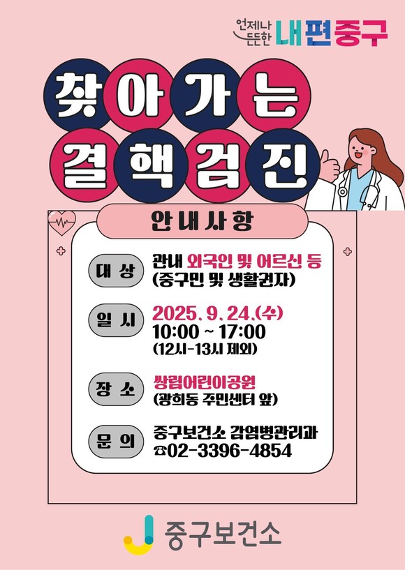 서울 중구가 결핵 조기 발견과 감염 확산 방지를 위해 오는 24일(수) 오전 10시부터 오후 5시까지 광희동 주민센터 앞 쌍림어린이공원에서 <찾아가는 결핵검진>을 무료로 실시한다.