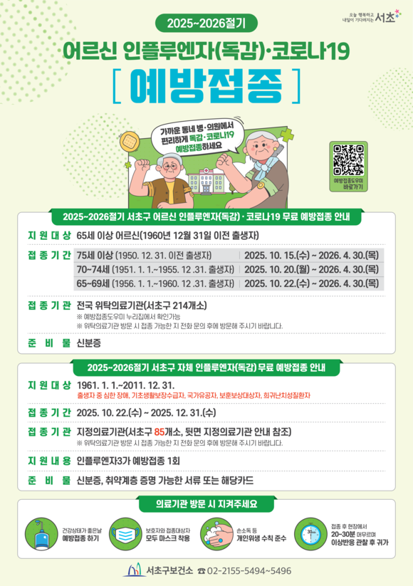 서울 서초구(구청장 전성수)는 올겨울 인플루엔자 유행에 대비해 인플루엔자(독감) 감염 시 중증화 위험이 높은 구민을 대상으로 2025~2026절기 인플루엔자 무료 예방접종을 실시한다.