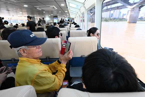 주말을 맞아 서울의 새로운 수상교통수단 '한강버스'에 탑승한 시민들이 선실에 앉아 창밖 풍경을 감상하며 한강버스 운항을 즐기고 있다. 사진=서울시청