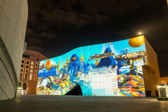 축제를 맞아 파라다이스빌딩은 외벽을 아트랩 페스티벌 콘셉트로 단장했다. 주요 작품 중 하나인 미디어 파사드 <바람의 항해자>는 본사 사옥과 인천 파라다이스시티 ‘크로마’ 외벽에 동시 상영하며 환상적 분위기를 연출한다. 인천을 상징하는 항공기와 선박의 궤적을 역동적으로 구현했다.