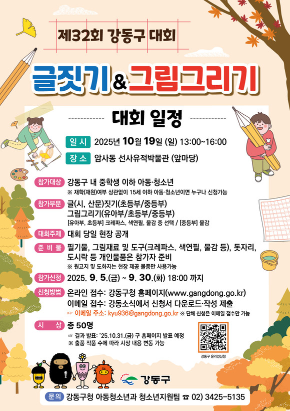 서울 강동구(구청장 이수희)는 오는 10월 19일 암사동 선사유적박물관에서 「제32회 강동구 아동·청소년 글짓기 및 그림그리기 대회」를 개최한다고 밝혔다.