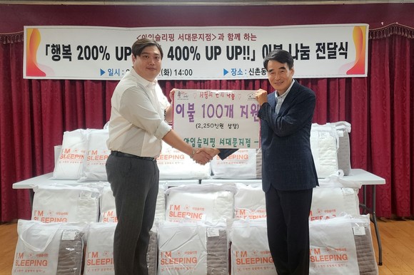 서울 서대문구 신촌동(동장 유명선)은 최근 아임슬리핑 서대문지점(대표 석동원)으로부터 취약계층을 위한 이불 100채(약 2,250만 원 상당)를 기탁받았다고 22일 밝혔다.