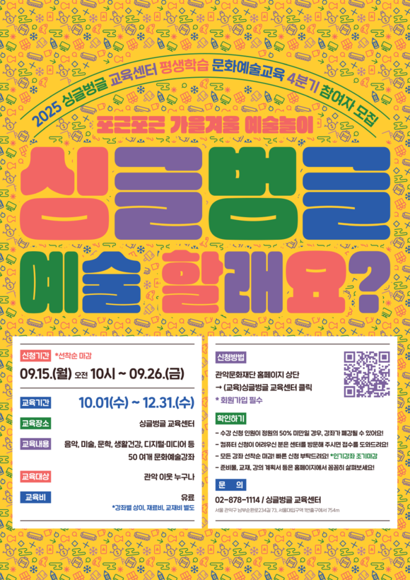 서울 관악문화재단(대표이사 소홍삼) 싱글벙글교육센터가 오는 9월 26일까지 ‘2025년 4분기 평생학습 문화예술교육 프로그램’ 수강생을 모집한다.