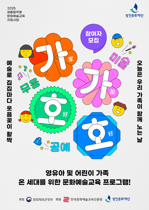 2025 생활밀착형 가족 문화예술교육 프로그램 <가가호호(家加好好)>는 광진문화재단과 한국문화예술교육진흥원이 주관하고, 문화체육관광부가 주최하는 사업으로 지난 4월 공모에 선정되었으며, 기존 지원금 4천만 원에 2천만 원을 추가로 확보하여 총 6천만 원의 규모로 사업을 더욱 풍성하게 운영할 예정이다.