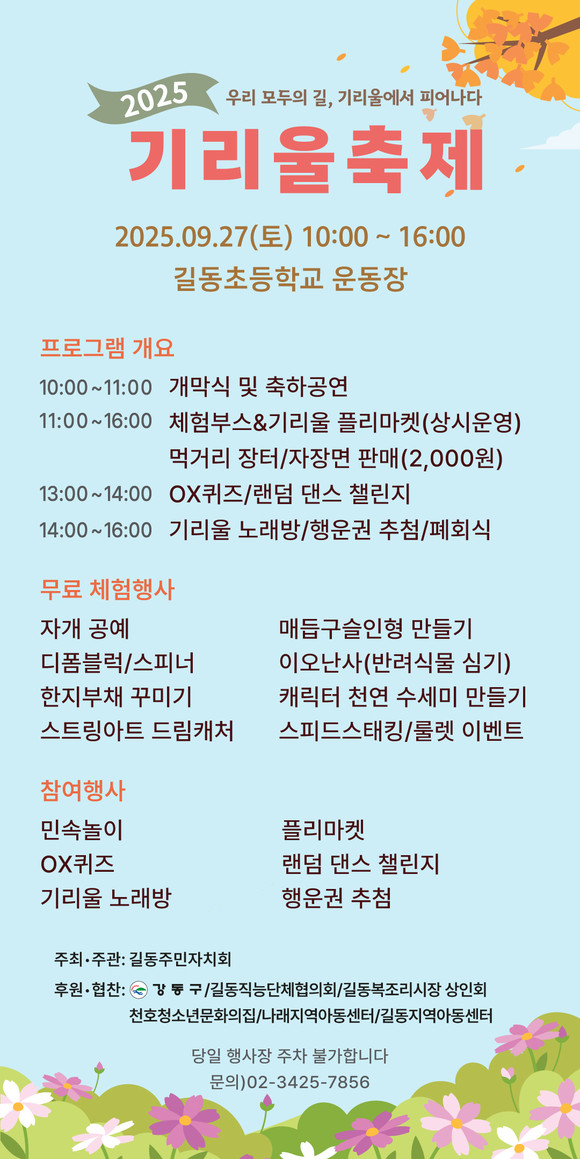 서울 강동구(구청장 이수희) 길동은 오는 27일 10시부터 16시까지 길동초등학교 운동장에서 주민 화합을 위한 ‘2025 기리울 축제’가 열린다고 밝혔다.