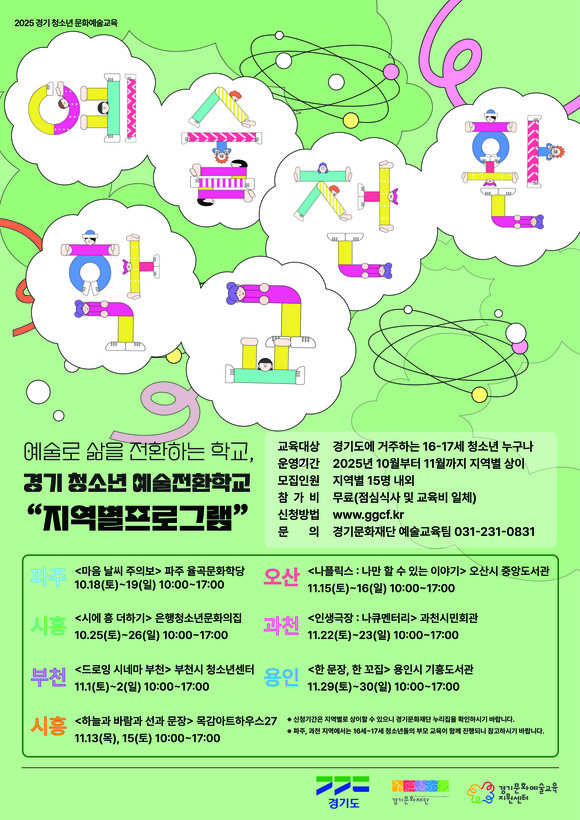 경기도와 경기문화재단은 16~17세 청소년들이 예술을 통해 자신을 돌아보고 미래를 설계할 수 있도록 돕는 ‘예술전환학교’를 10월부터 11월까지 도내 6개 지역에서 7개 프로그램을 운영한다. 지역별로 파주문화재단, 과천문화재단, 시흥시청소년재단, 부천시청소년센터, 시흥시 문화예술과, 오산시 중앙도서관, 용인시 기흥도서관이 청소년 문화예술교육 프로그램 운영을 위해 함께 협력하여 진행한다.