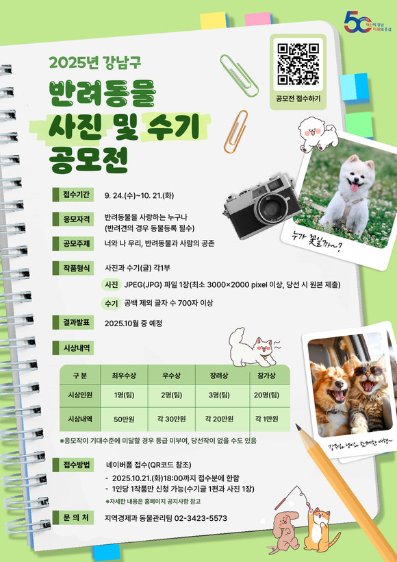 조성명 강남구청장은 “이번 공모전이 반려동물과 반려인이 함께한 일상을 공유하는 소통의 장이 되길 바란다”며 “이를 계기로 반려동물에 대한 인식을 개선하고, 사람과 동물이 공존하는 성숙한 문화가 확산되길 기대한다”고 말했다.