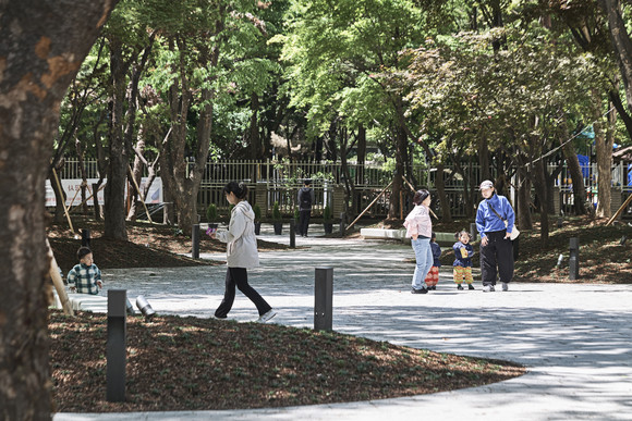 구는 명일광장을 ‘조용한 휴식, 안전한 체류, 활기 있는 공간’으로 조성하기 위해 주민·학생·상인으로 구성된 협의체를 운영하며, 기존 관목을 정비하고 폐쇄적인 공간을 유선형·개방형 구조로 개선해 안전성과 이용 편의를 높였다. 또한 곡선적·유기적 디자인과 수목 존(zone) 배치, 은은한 간접조명을 적용해 야간에도 이용자가 심리적 안정감을 느낄 수 있도록 했다.