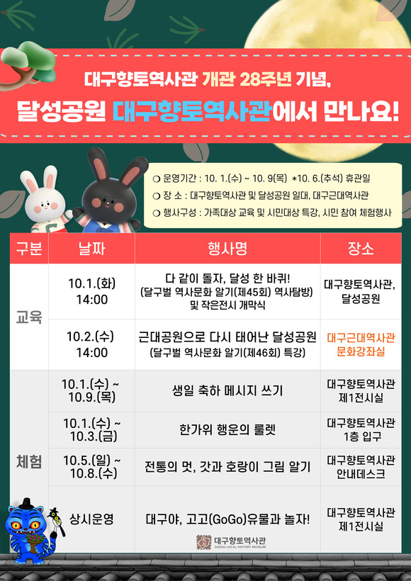 10월 5일(일)부터 8일(수)까지는 추석을 맞아 매일 선착순 어린이 100명을 대상으로 ‘전통의 멋, 갓과 호랑이 그림 알기’라는 주제로 갓 만들기 체험과 맹호도 스크래치 그림 체험을 운영한다. ‘대구향토역사관 생일 축하메시지 쓰기’는 대구향토역사관 1층 입구에서 10월 1일(수)부터 9일(목)까지 진행되며 대구지역 출토유물을 직접 만져보며 체험할 수 있는 ‘대구야! 고고유물과 놀자’ 프로그램 또한 대구향토역사관 1층 상설전시실에서 기간 내 함께 운영된다. 추석 당일인 6일(월)은 하루 휴관한다.