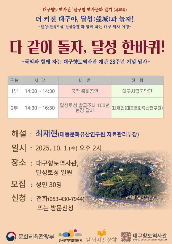 먼저, 기념일인 10월 1일(화) 오후 2시에는 대구향토역사관 1층에서 대구시립국악단 축하공연을 개최하고, 대동문화유산연구원 최재현 부장의 안내로 ‘다 같이 돌자, 달성(達城) 한 바퀴’ 현장 탐방을 진행한다. ‘달구벌 역사문화 알기’ 제45회 행사로 마련된 이번 역사 탐방에서는 일제강점기부터 최근까지 100여 년간 진행되어 온 달성토성 발굴조사 장소들을 직접 찾아서 달성토성의 특징과 의미에 대해 살펴보는 시간을 가진다.