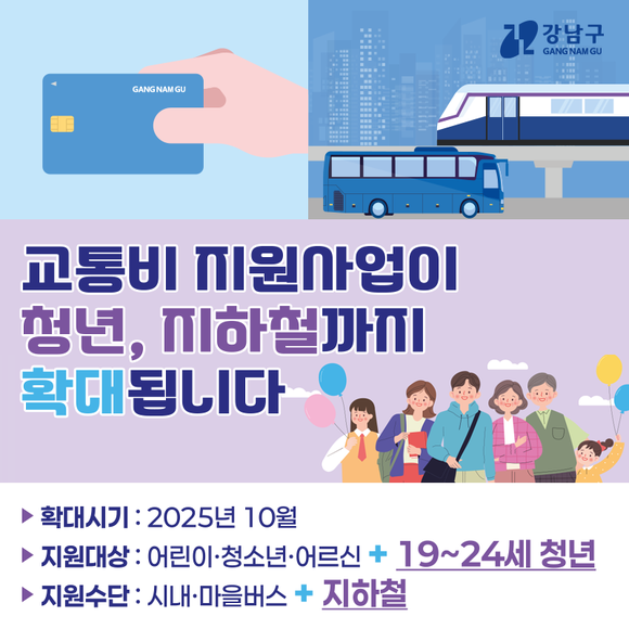 서울 강남구(구청장 조성명)가 오는 10월부터 교통비 지원 사업을 확대 추진한다. 지난해 9월 서울시 최초로 시행한 이 사업은 시행 1년 만에 7만여 명이 가입하고 대중교통 이용량이 9.7% 증가하는 등 정책 효과를 입증했다. 구는 이번에 지원 대상을 19~24세 청년까지 넓히고, 지원 범위를 버스에서 지하철까지 확대한다.