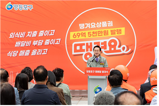 최호권 영등포구청장은 "'땡배달'은 소상공인과 소비자 모두의 비용 부담을 해소하고, 지역 경제에 활력을 불어넣는 착한 배달 서비스”라며 “영등포 구석구석을 누비며 행복을 전하는 한 끼 친구로 자리 잡길 기대한다”라고 전했다.