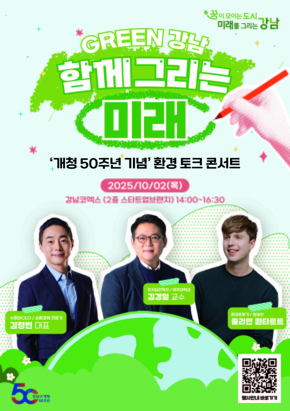 서울 강남구(구청장 조성명)가 개청 50주년을 기념해 오는 10월 2일 오후 2시 코엑스 스타트업브랜치에서 ‘GREEN 강남, 함께 그리는 미래’를 주제로 ‘환경 토크 콘서트’를 개최한다.