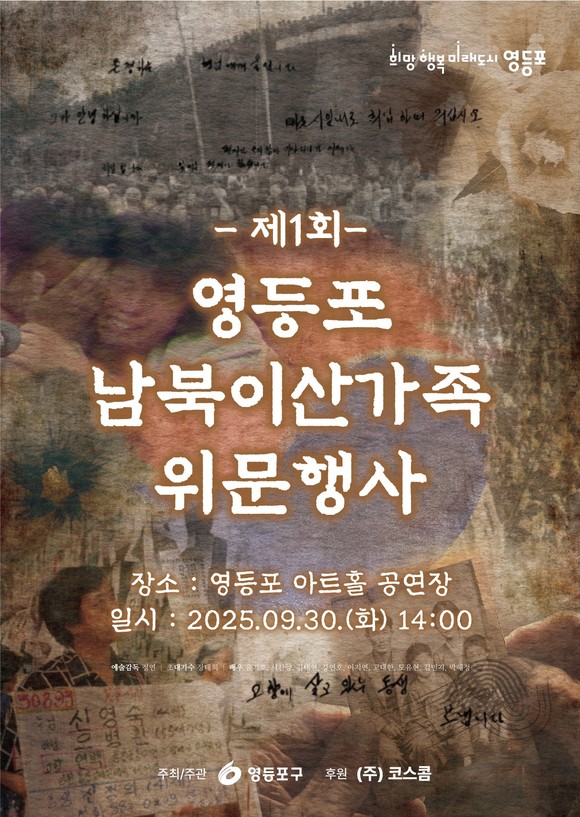 공연은 9월 30일 오후 2시 영등포 아트홀에서 열린다. 남북 이산가족과 후손, 지역 주민 등 누구나 사전 예약 없이 당일 현장 방문으로 관람할 수 있으며, 선착순 500석이 마련돼 있다. 자세한 사항은 구청 자치행정과로 문의하면 된다.