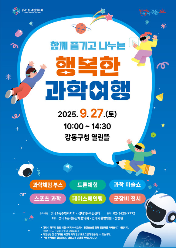 서울 강동구(구청장 이수희) 성내1동은 오는 27일(토) 10시부터 14시 30분까지 강동구청 열린뜰에서 ‘제5회 함께 즐기고 나누는 행복한 과학여행’ 축제를 개최한다고 밝혔다.