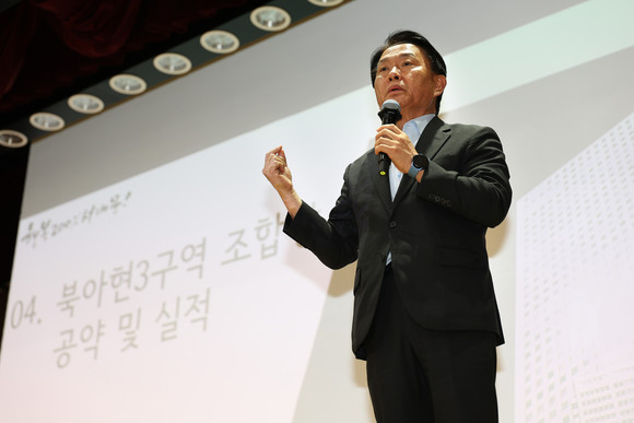 북아현3구역 조합운영실태 합동점검 결과 설명회’에서 발언하는 이성헌 서대문구청장. 사진=서대문구청