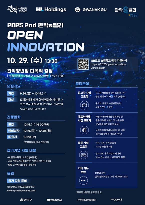 서울 관악구(구청장 박준희)가 자동차, 물류 분야 글로벌 네트워크를 보유한 ‘HL홀딩스’와 함께 ‘2025 제2회 관악S밸리 오픈 이노베이션’에 참가할 기업을 모집한다.