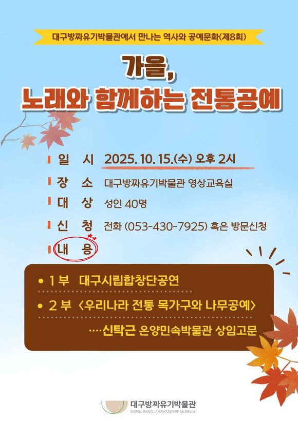 (재)대구문화예술진흥원 박물관운영본부 소속 대구방짜유기박물관은 10월에도 전통공예와 함께 하는 프로그램을 운영한다. 10월 15일(수) 오후 2시에는 대구시립합창단 공연과 함께 우리나라 전통 목가구와 목공예의 아름다움을 이해하는 전문가 특강을 개최하며, 10월 25일(토)에는 가족체험 ‘도란도란 방짜유기박물관 나들이’를 운영한다.