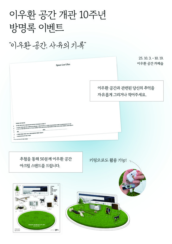 이우환 공간과 함께한 10년의 추억을 방명록으로 공유하는 행사로 10월 19일 까지만 진행한다. 이우환 공간 내 카페숍에서 참여할 수 있으며 인상 깊은 방명록을 남긴 참여자 50명을 선정해 기념품을 증정한다.
