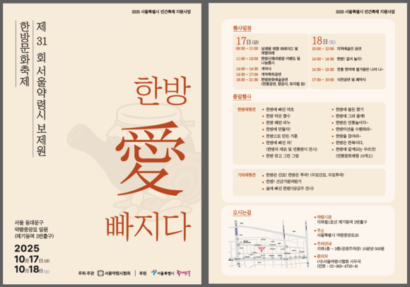 서울 동대문구(구청장 이필형)는 오는 17일부터 18일까지 양일간 서울약령시 일대에서 ‘제31회 서울약령시 보제원 한방문화축제’를 개최한다고 밝혔다.