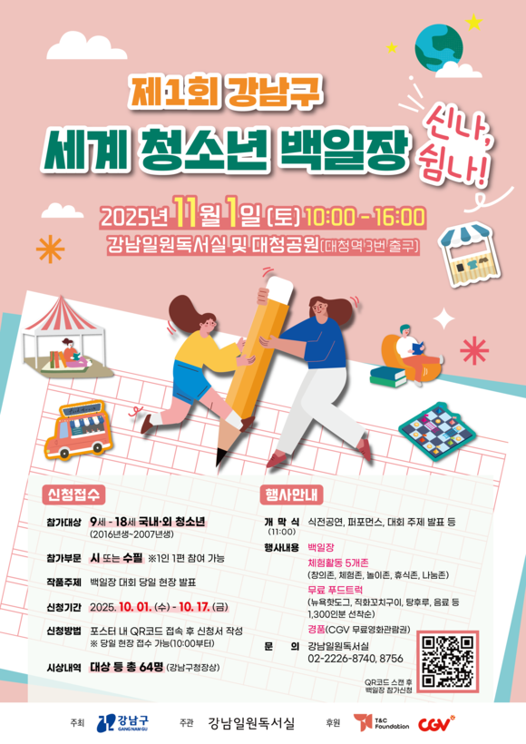 서울 강남구(구청장 조성명)가 오는 11월 1일 오전 10시부터 오후 4시까지 강남일원독서실과 대청공원 일대에서 ‘제1회 강남구 세계청소년백일장 신나, 쉼나!’를 개최한다. 이 행사는 국내‧외 국적 청소년이 함께하는 전국 최초의 기초지자체 주관 백일장으로, 다문화 시대와 K-컬처 확산 흐름에 발맞춘 문학축제다.