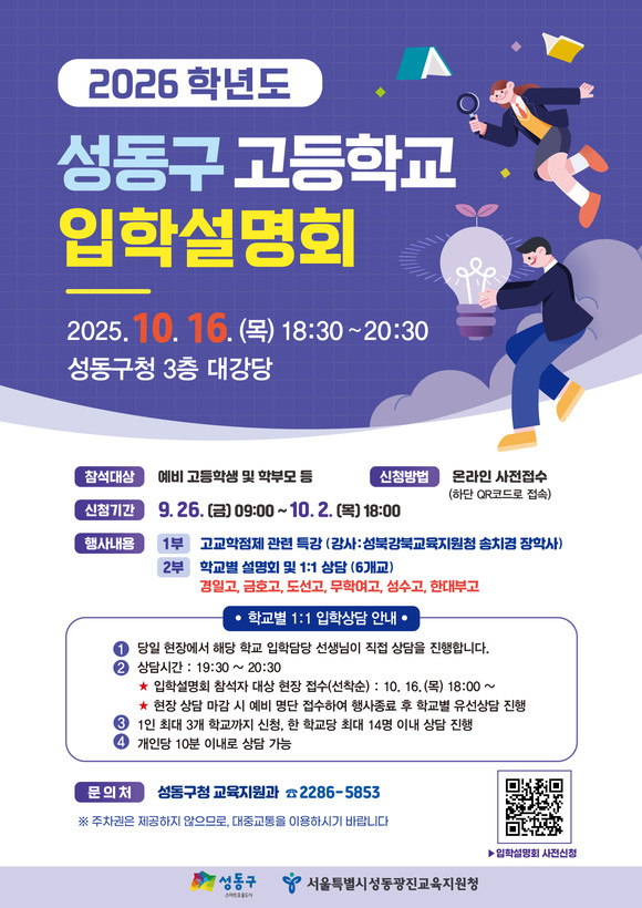 서울 성동구(구청장 정원오)는 오는 10월 16일 오후 6시 30분부터 성동구청 3층 대강당에서 고등학교 진학을 앞둔 학생과 학부모를 대상으로 ‘2026학년도 고등학교 입학설명회’를 개최한다고 밝혔다.