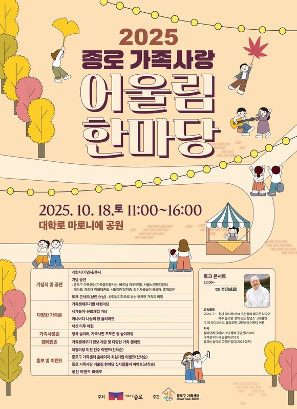 서울 종로구(구청장 정문헌)는 10월 18일 11시부터 16시까지 대학로 마로니에공원에서 「2025 종로 가족사랑 어울림한마당」을 개최한다.