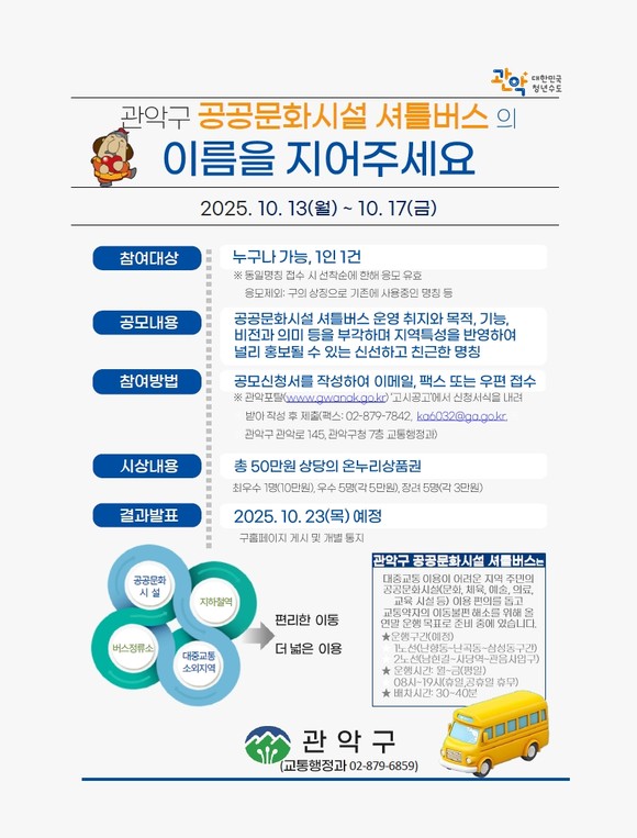 아울러 구는 오는 17일까지 공공문화시설 셔틀버스 명칭을 공모한다. 지역 제한없이 누구나 응모할 수 있으며 셔틀버스의 목적과 비전을 담아낸 이름을 지어 담당자 이메일 또는 팩스로 제출하면 된다. 당선작은 10월 23일 개별 통지되고, 구청 홈페이지에도 게시될 예정이다.