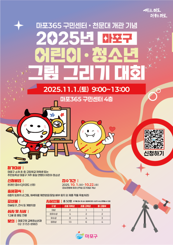 서울 마포구(구청장 박강수)는 10월 22일까지 2025년 하반기 ‘마포구 어린이·청소년 그림 그리기 대회’ 참여자를 모집한다.
