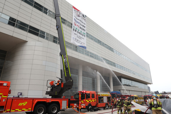 전기차 화재 대응 훈련은 실제 폐차 차량에 불을 붙여 진행하며, 소방헬기를 이용한 로프 들것 구조, 드론을 활용한 호흡기 전달 훈련도 함께 이뤄진다. 의용소방대와 자원봉사자들은 건물 안팎에서 대피 유도에 나선다.