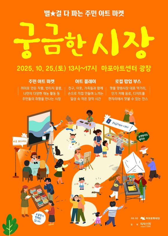 서울 마포문화재단(대표이사 고영근)은 오는 10월 25일 마포아트센터 야외광장에서 주민아트마켓 <궁금한 시장> 을 개최한다. 지난해 첫 선을 보인 <궁금한 시장> 은 반나절 동안 약 1,400여명이 참여하며 셀러와 당일 방문객 모두에게 높은 호응을 보였다. 완연한 가을 날씨에 야외에서 온 가족이 함께 즐길 수 있는 프로그램으로 올해는 한층 더 다채로운 구성으로 돌아왔다.
