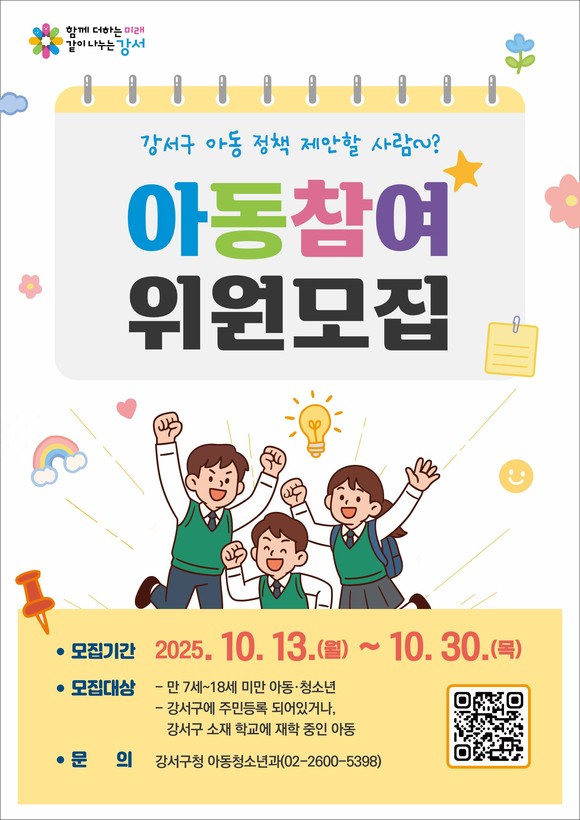 서울 강서구(구청장 진교훈)는 아동정책을 함께 만들어갈 ‘10기 아동참여위원회’ 위원을 오는 30일까지 모집한다고 밝혔다.
