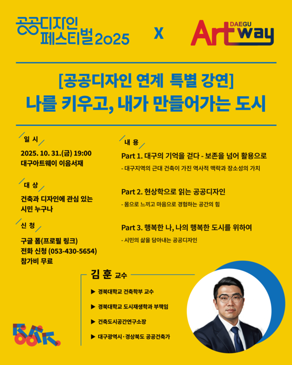 31일 저녁 7시에는 대구광역시·경상북도 공공건축가이자 건축도시공간연구소 소장인 김훈 교수(경북대학교 건축학부)의 공공디자인 강연이 진행된다. 건축과 공공디자인 그리고 ‘공존’의 가치에 대한 생각을 나누는 인문학 프로그램으로 구성될 예정이다.