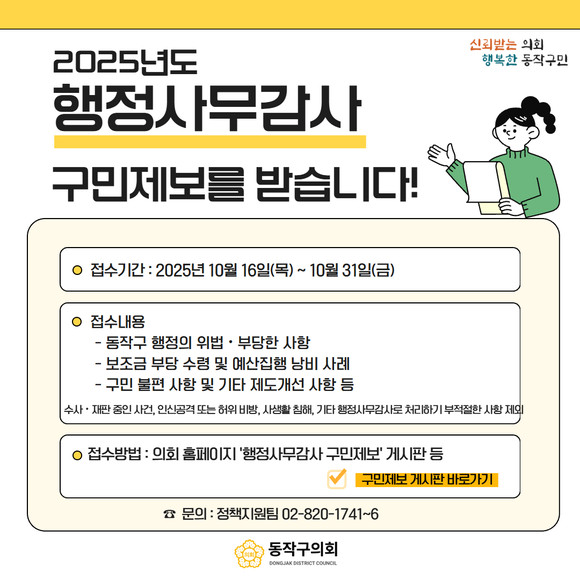 동작구의회(의장 정재천)는 오는 11월 25일부터 9일간 진행되는 ‘2025년도 행정사무감사’를 앞두고, 10월 16일부터 31일까지 구민 제보를 접수한다.