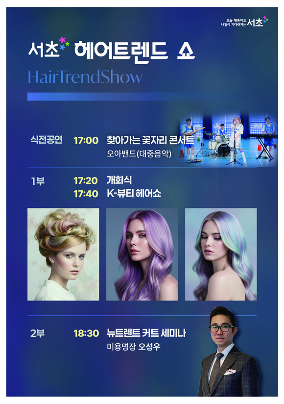 이날 오후 5시에는 4인조 감성 인디밴드인 ‘오아밴드’가 ‘찾아가는 꽃자리 콘서트’ 공연을 통해 ‘서초 헤어쇼'의 시작을 알린다. 이어지는 1부 프로그램에서는 개회식과 함께 ‘K-뷰티 헤어쇼’가 펼쳐진다. K-뷰티의 과거와 현재를 잇는 트렌드 헤어 퍼포먼스를 통해 아름다운 서초의 감성을 담은 다채로운 헤어 스타일의 무대가 선보일 예정이다.