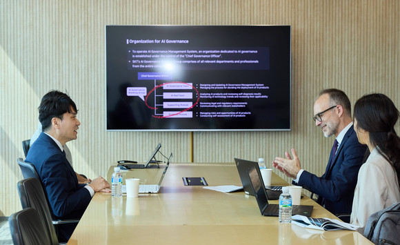 SKT는 최근 서울 을지로 본사에서 열린 미팅에서 차호범 CPO가 팀 엥겔하르트(Tim Engelhardt) 유엔 인권담당관 등 OHCHR 관계자들에게 자사가 수립한 AI 거버넌스 기본 원칙 ‘T.H.E. AI’와 사내 ‘AI 거버넌스 포털’을 소개했다고 19일 밝혔다.