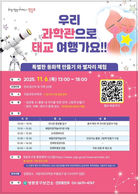 서울 영등포구(구청장 최호권)가 예비 부모와 태아가 함께 교감하는 특별 체험 프로그램 ‘과천과학관 태교 여행’ 참여자를 모집한다고 밝혔다.