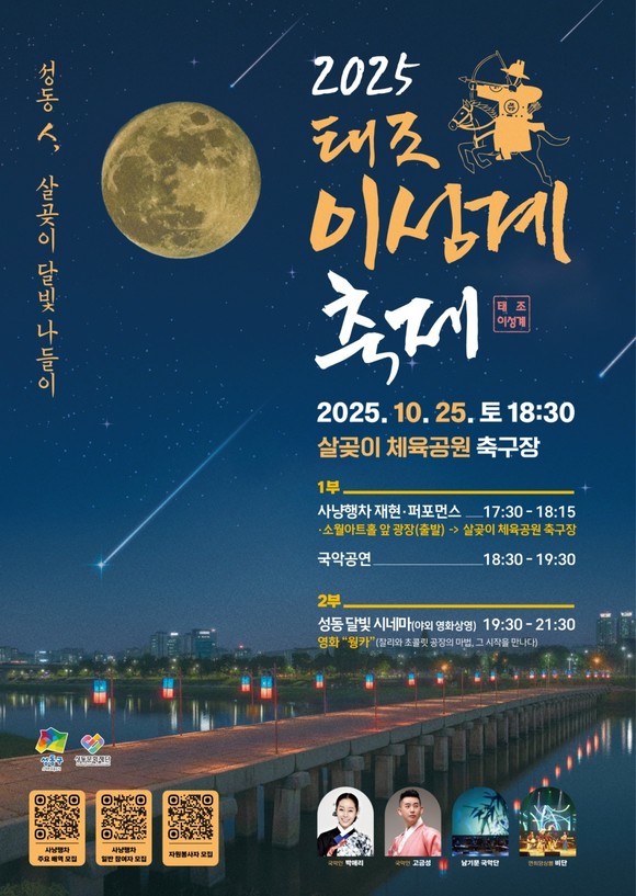서울 성동구(구청장 정원오)는 오는 10월 25일 살곶이 체육공원 일대에서 '2025년 태조 이성계 축제'를 개최한다고 밝혔다.