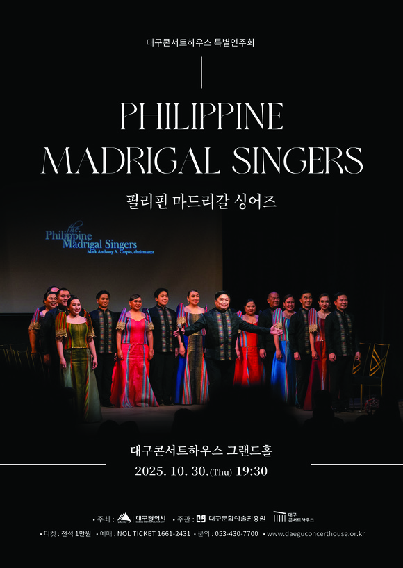 오는 10월 30일(목) 오후 7시 30분, 대구콘서트하우스 그랜드홀에서는 세계 최정상의 아카펠라 합창단 ‘필리핀 마드리갈 싱어즈(Philippine Madrigal Singers)’가 천상의 목소리로 대구를 물들인다. 이번 공연은 대구콘서트하우스가 기획한 합창공연으로 아시아 각국을 순회하는 필리핀 마드리갈 싱어즈의 글로벌 투어 중 가장 주목받는 일정으로 꼽히고 있다.