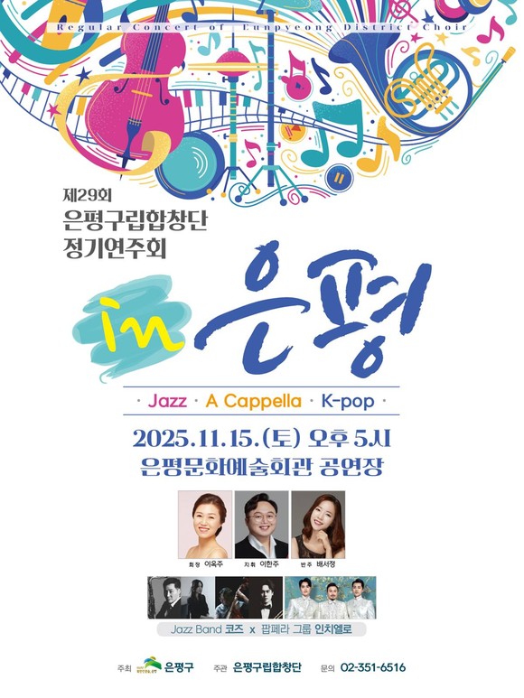 공연에는 은평구립합창단을 비롯해 재즈 밴드 ‘코즈’, 팝페라 그룹 ‘인치엘로’가 함께 참여해 재즈, 아카펠라, 케이팝(K-POP) 등 다양한 장르의 음악을 선보이며 관객과 함께 소통하는 풍성하고 다채로운 무대가 펼쳐진다.