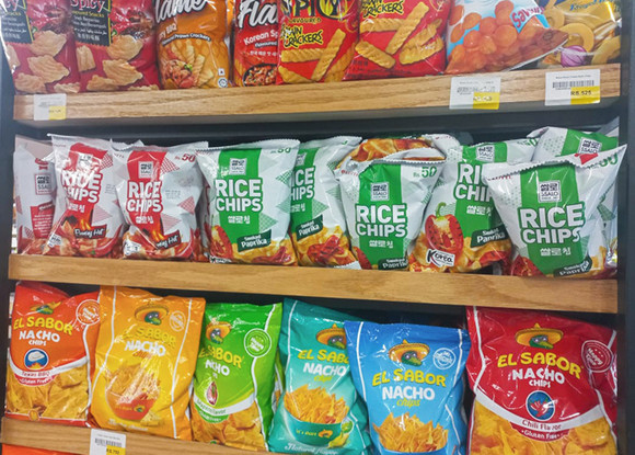 파키스탄에서 판매하는 ‘쌀로칩 플레이밍 핫’, ‘쌀로칩 스모크드 파프리카’가 진열된 모습. 사진=롯데웰푸드