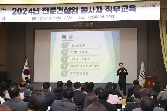 서울 서초구(구청장 전성수)가 23일(목) 오후 3시 서초구청 2층 대강당에서 지역 내 178개 전문건설업체 대표자와 업무 관련자를 대상으로 ‘2025년 전문건설업 종사자 직무교육’을 실시한다고 밝혔다.
