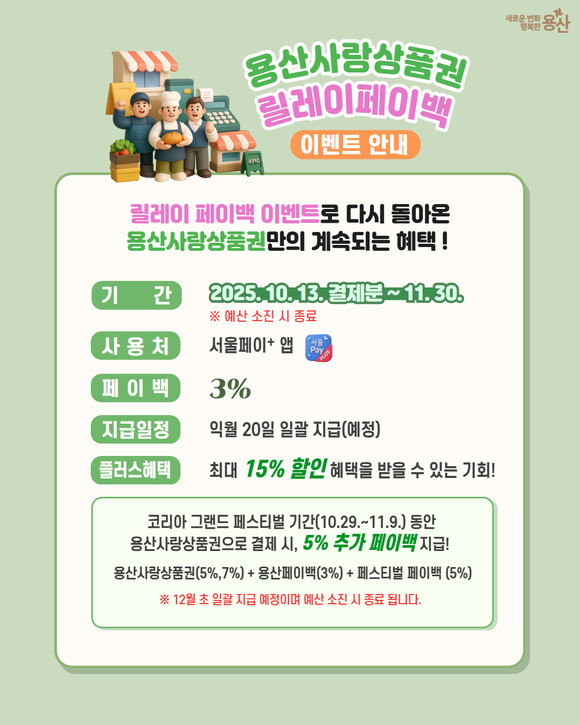 특히 10월 29일부터 11월 9일까지 열리는 ‘코리아 그랜드 페스티벌’ 기간에 용산사랑상품권으로 결제하면, 추가 5% 페이백 혜택이 제공될 예정이다. 이 기간에는 기존 3% 페이백 혜택을 포함해 최대 15%의 할인 혜택을 받을 수 있다. 다만 해당 페이백은 예산 한도 내에서 선착순으로 지급되며, 예산이 조기 소진될 경우 행사는 종료된다.