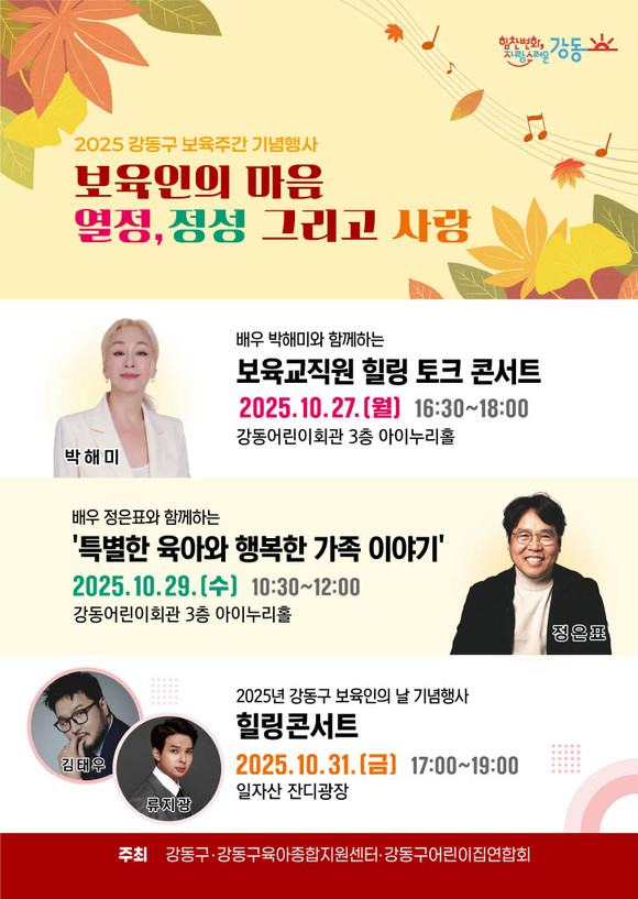 서울 강동구(구청장 이수희)는 10월 보육주간을 맞아 강동구육아종합지원센터와 함께 보육 현장에서 애쓰는 보육교직원을 응원하고, 부모들과 실질적인 육아 경험을 나누는 ‘힐링 토크 콘서트 및 부모특강’을 개최한다고 22일 밝혔다.