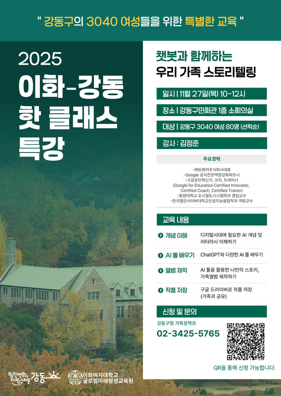 이수희 강동구청장은 “3040 세대 여성들이 디지털 시대에 꼭 필요한 AI 역량을 쉽게 키울 수 있도록 실습 중심의 교육을 마련했다”라며, “‘이화강동 핫 클래스’에 대한 높은 호응에 힘입어, 내년부터 확대 운영을 검토하고 있으며, 앞으로도 구민의 일상에 실질적인 도움이 되는 프로그램을 지속 발굴 운영해가겠다”라고 말했다.