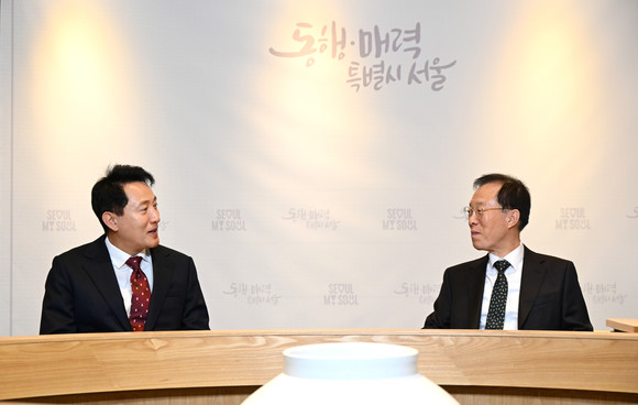오세훈 서울시장이 22일(수) 오후 3시 서울시청 집무실(6층)에서 이석연 국민통합위원회 신임 위원장을 만나 다양한 협력 방안을 논의했다. 이번 면담은 이석연 위원장이 지난달 15일 국민통합위원회 위원장으로 취임한 후 첫 자치단체장 면담일정이다.