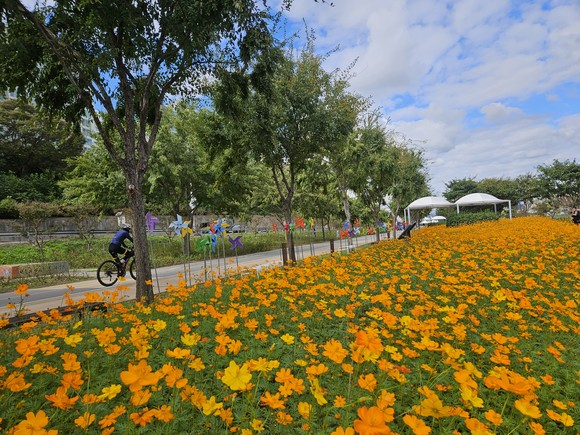 특히 10월 중순부터 절정을 맞은 황화코스모스 군락은 연이은 가을비 이후 더욱 싱그럽게 만개했다. 가을 햇살 아래 바람에 흔들리는 노란 꽃물결이 시민들의 시선을 사로잡으며, 산책로를 찾는 발길이 이어지고 있다.